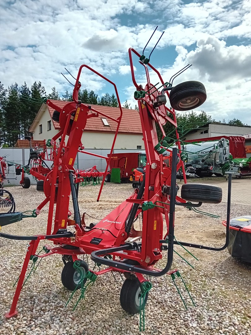 Przetrząsacz z przekładnią CompactLine, mocną prostokątną ramą i palcami sprężynowymi Super-C. Hydrauliczne składanie, WOM 540 obr./min ze sprzęgłem, 3-stopniowa regulacja rozrzutu bez narzędzi, centralne ustawienie przy granicy pola, koła 16x6,5-8.